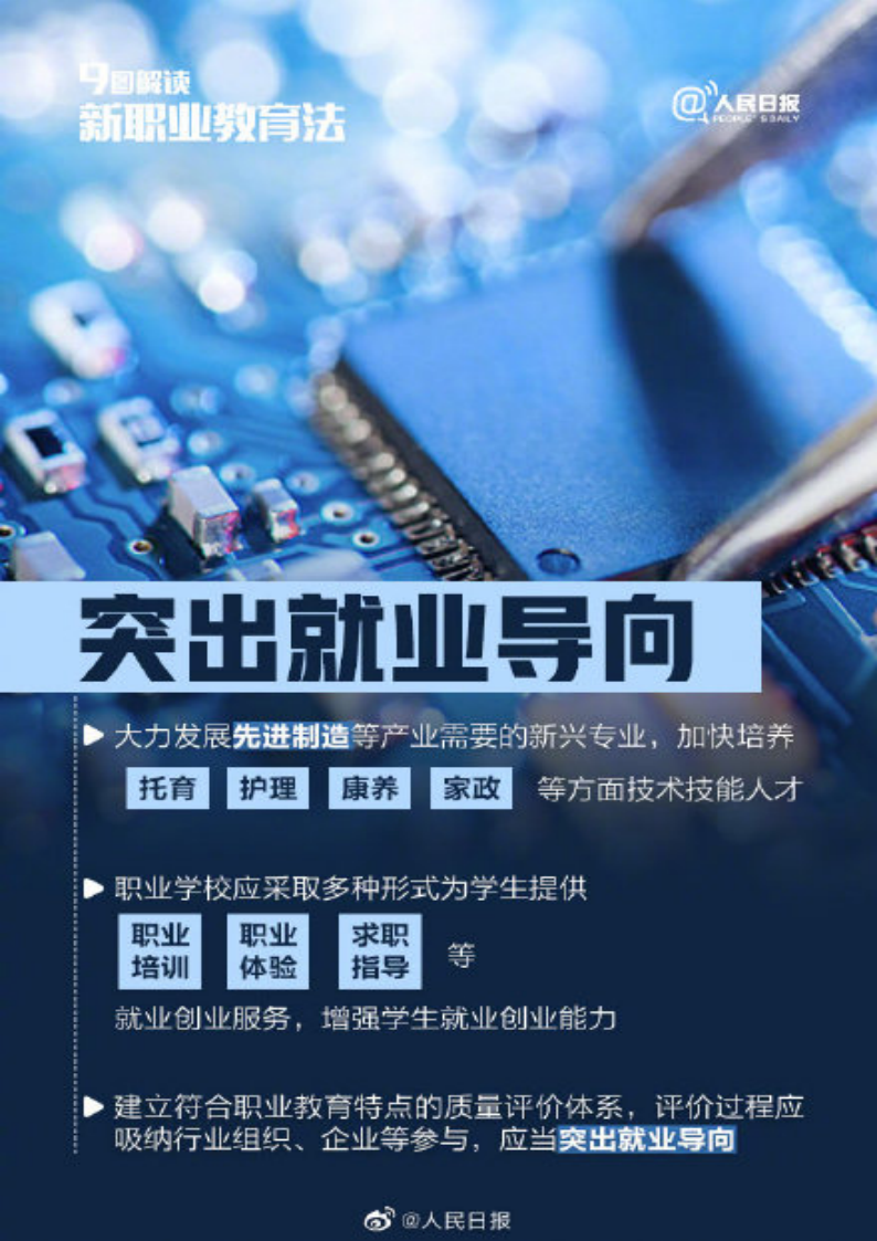 亮点八:新法进一步明确职业教育面向市场、服务发展、促进就业的办学方向。教育规划上,规定发展职业教育应当与促进就业创业、推动发展方式转变和产业结构调整等整体部署、统筹实施。发展重点上,规定大力发展先进制造等产业需要的新兴专业,加快培养托育、护理、康养、家政等方面技术技能人才。办学模式上,规定职业学校可以根据产业需求,依法自主设置专业、设置学习制度、选编教材、评聘教师等;应当建立就业创业促进机制,提供就业创业服务,增强学生就业创业能力。评价机制上,规定建立符合职业教育特点的质量评价体系,评价过程应当吸纳行业组织、企业等参与,应当突出就业导向。