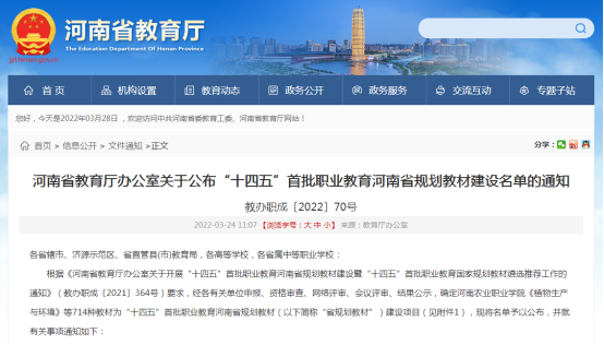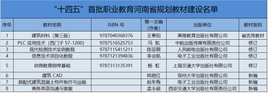 根据河南省教育厅办公室《关于公布“十四五”首批职业教育河南省规划教材建设名单的通知》,我校共有8种教材获批“十四五”职业教育河南省规划教材。其中,王春阳主编的《建筑材料(第三版)》被评为“十四五”省优秀教材,并且成为职业教育国家规划教材。