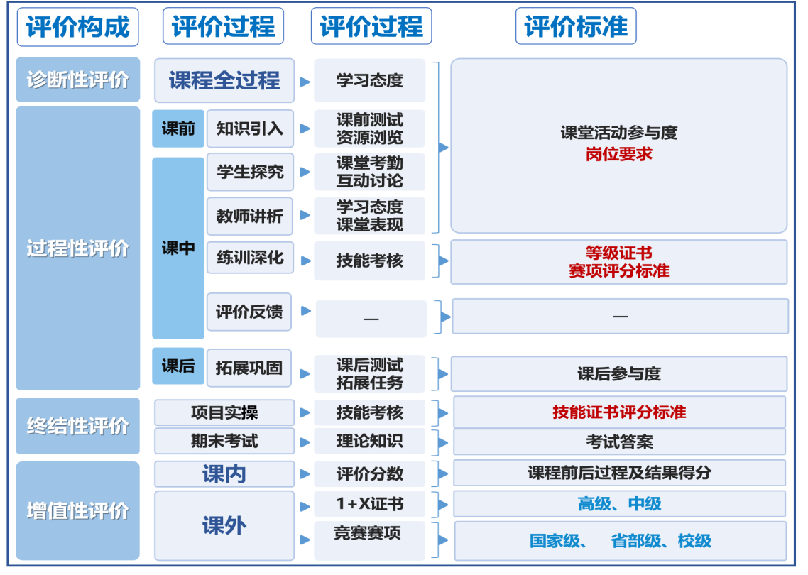 教学评价基于各专业课程标准、职业技能等级标准要求,把综合性评价贯穿课程全过程,从“诊断性、过程性、终结性、增值性”四个维度进行评价,增值性评价在评价基础上奖励附加分。利用学习通、虚拟仿真软件、实操考核等信息化平台收集教学全过程数据,及时发现教学效果与教学目标之间的偏差,优化教学策略;关注学生每次课的进步增值,及时表扬进步,反思退步,鼓励学生扬长补短,即诊即改,实现“即诊即改、以评促学”。