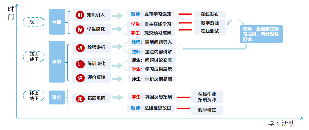 “双线”有两重含义,一是指教师和学生、教与学的两种角色线,二是指线上线下两种教学场景线,“三段”指课前、课中、课后三个教学阶段,“六步”指知识引入、学生探究、教师讲析、练训深化、评价反馈、拓展巩固六个教学步骤。这六个教学步骤按照课前、课中、课后三个阶段设置,包括了师生教学活动的全过程。