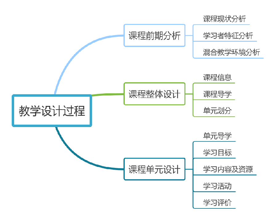 混合教学设计主要包括三部分:课程前期分析,旨在明确课程基本情况、分析课程现有问题;课程整体设计,旨在围绕教学目标搭建课程框架;课程单元设计,旨在针对各个学习单元进行设计,是混合式教学设计的核心环节。
