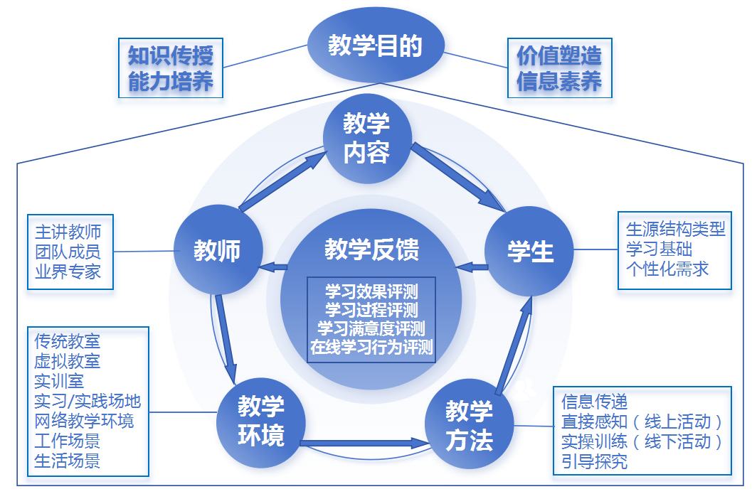 教学目的通过课程开发与设计,指导教学的全过程。其他六个要素依据目标进行设计和配置。学生是学习的主体,所有的教学要素都围绕学生这一主体加以组织;教学内容需要围绕教学目的进行选择和组织;教学方法是为把教学内容内化为学生的知识、能力和价值观,从而达成教学目标的途径;教学反馈是连接教师和学生,促进师生交互,实现教学目的的关键因素;教学目的是否具有可测量性、教学内容和方法是否能够实现教学目的等,都需要通过教学评价来验证,并将评价的结果反馈给学生,指导学生的学习;教学环境一般由学校统一构建,教师的信息化教学意识和能力决定了这些教学环境是否能够发挥出其教学的潜能,从而影响教学内容的呈现、教学方法实施的可能性与适用性,最终影响教学目标的达成。